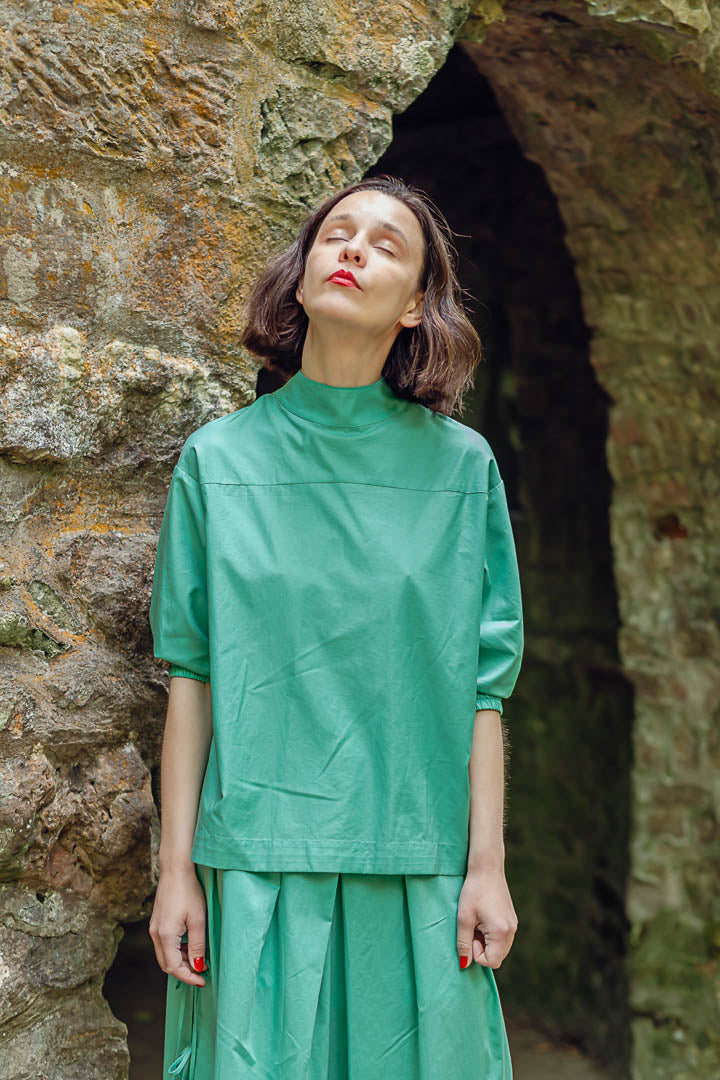 Crafted from soft Indian cotton, the KYA top embodies effortless elegance. Its straight silhouette falls loosely over the body, balanced by elbow-length sleeves finished with elastic cuffs and a refined standing collar. At the back, a delicate button closure adds a subtle point of interest, completing the design with quiet sophistication.